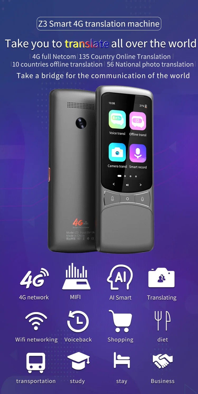 De Z3 Smart Translator Pro™ is een krachtige, draagbare AI-vertaalmachine met spraakvertaling, fotovertaling én offline functies. Ideaal voor reizen, werk, studie en internationale communicatie.